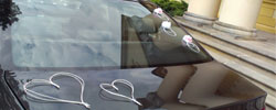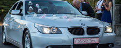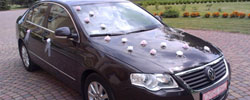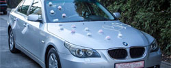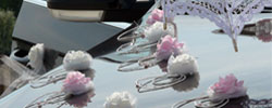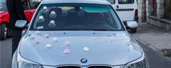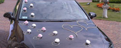 Oferujemy Państwu usługę udekorowania samochodu ślubnego. Dekoracja składa się z różowych i białych kwiatów ułożonych na przedniej i tylniej masce samochodu, delikatnej dekoracji każdej z klamek oraz rattanowych serc - większych na przedzie auta i mniejszych na tyle samochodu